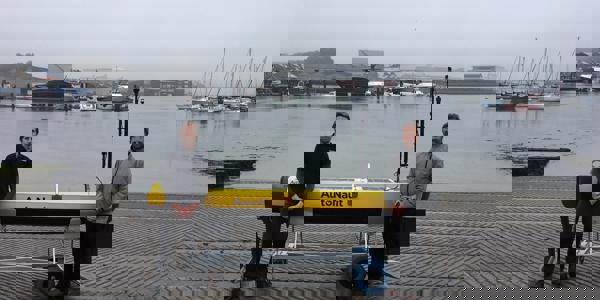 The vessel being tested and sea trialed at Turnchapel Wharf this month was the AutoNaut 5.0, their larger vessel designed for carrying a larger capacity of sensors, batteries and solar panels. The hull's design gives a flexible payload and, for ease of transport, the hull can break down into two halves.