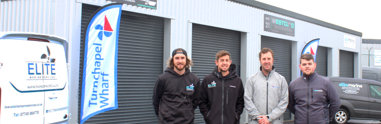 Caption: Steve Putt and Lewis Huddy of Elite Marine Engineering, Ryan Bonney, Site Manager at Turnchapel Wharf, and Reece Larson of Elec Marine